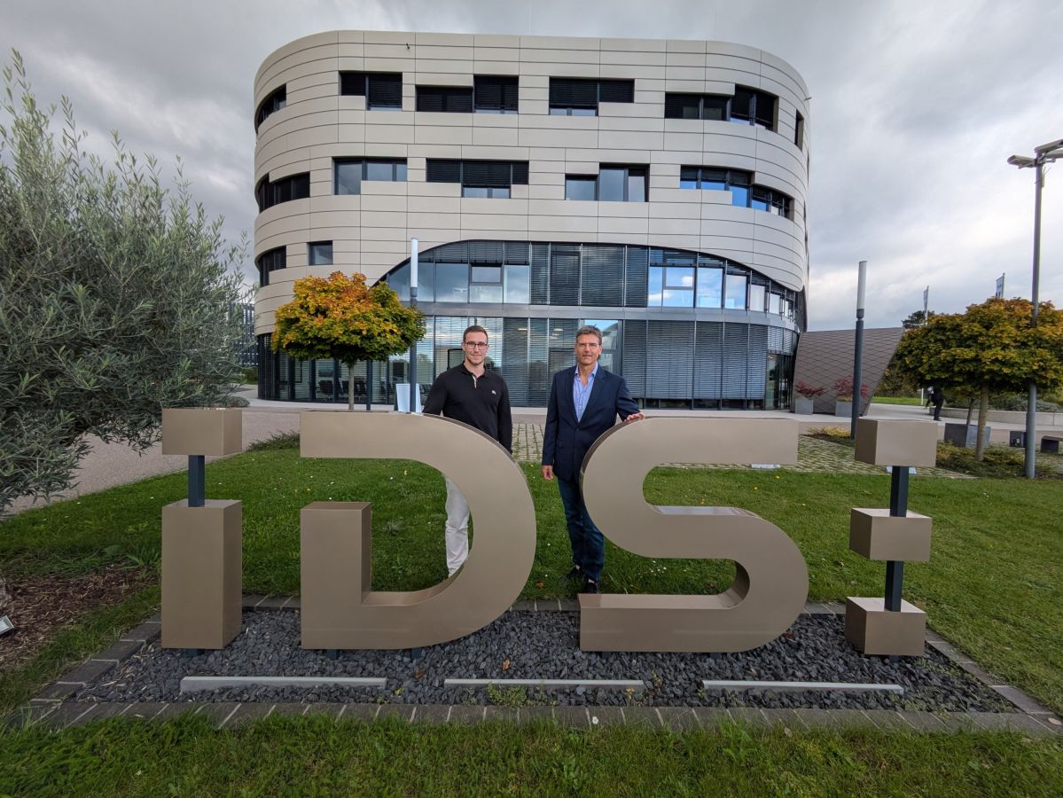Preisträger Jonas Gaißer und Professor Dr. Ing Heiko Thimm vor dem IDS Firmengebäude (© IDS)